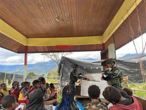 Kegiatan belajar di Pos Eromaga ini bukan sekadar rutinitas—ia adalah denyut harapan di tengah terpencilnya akses. Dalam dekapan alam Pegunungan Papua yang megah, para prajurit dengan rompi dan helm tetap, mengajar dengan hati, menyambung harapan dari generasi ke generasi.