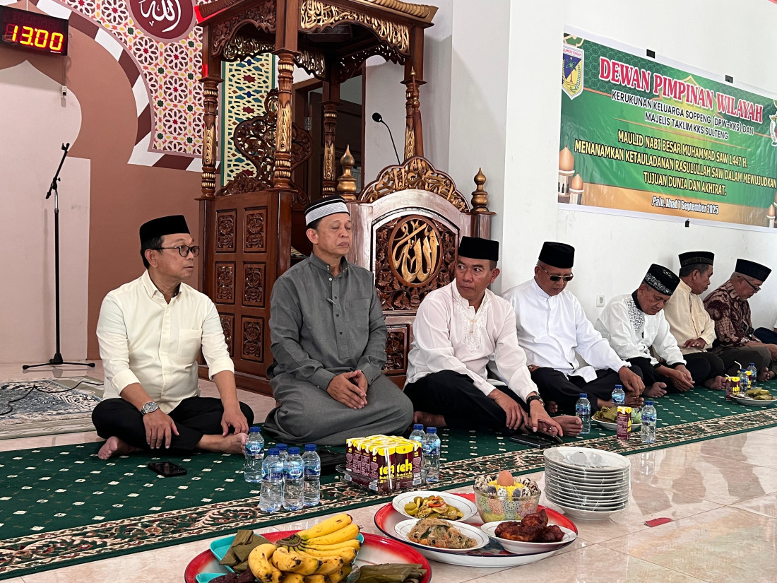 PALU, KABARONES.COM – Bupati Soppeng, H. Suwardi Haseng, S.E., menghadiri peringatan Maulid Nabi Muhammad SAW 1447 Hijriah/2025 Masehi yang diselenggarakan oleh Kerukunan Keluarga Soppeng (KKS) Provinsi Sulawesi Tengah bekerja sama dengan Majelis Taklim KKS. Acara penuh kehangatan yang dipadati ratusan warga KKS ini berlangsung khidmat di Masjid Transmigrasi, Jalan Kartini, Palu, pada Ahad (7/9/2025), menciptakan nuansa kekeluargaan yang kental layaknya di tanah Soppeng sendiri.